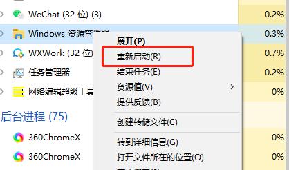 4、然后打开任务管理器,重新启动“Windows资源管理器”就行了,如下图所示。