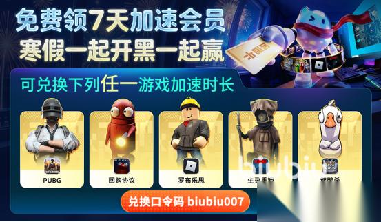 还有值得最推荐的一方面就是人们比较关注的福利方面了,也为所有的人群提供了免费体验的时长,新人想在寒假期间体验5款指定的游戏时,可以任选1款,就可利用【biubiu007】,可有效获得7天的加速特权,其中包括绝地求生或者是生灵重塑等等,活动时间2月10日-3月9日领取。