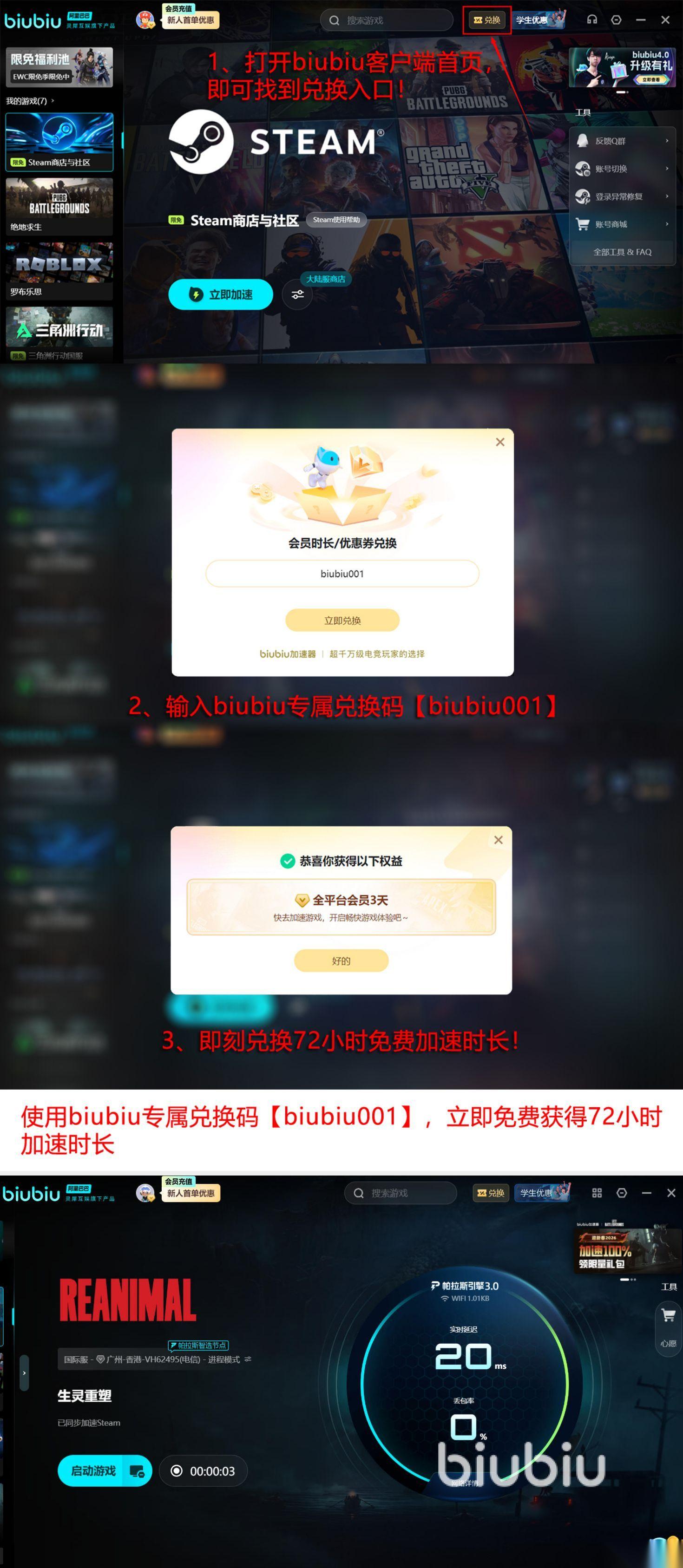 比如当大家首次利用账号激活之后,就会拥有24小时的加速时间。就是用【biubiu001】立即获得三天的免费特权。这种方式针对于所有的游戏,就连老用户也可轻松兑换,这样总计就有96小时。其次两种不同的方式中挑选其一,这两种方式都可以和账号激活的方式累积下来,但是却不能同时使用,