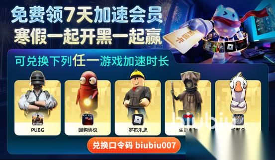 很多玩家对加速工具有所顾虑,官方早已经意识到这一点,因此推送出免费试用活动兑换活动可以2选1,兑换码为【biubiu007】,可直接兑换指定5款游戏中的任意一款,7天免费加速时长,活动时间2月10日-3月9日,包含鹅鸭杀,绝地求生等热门作品。