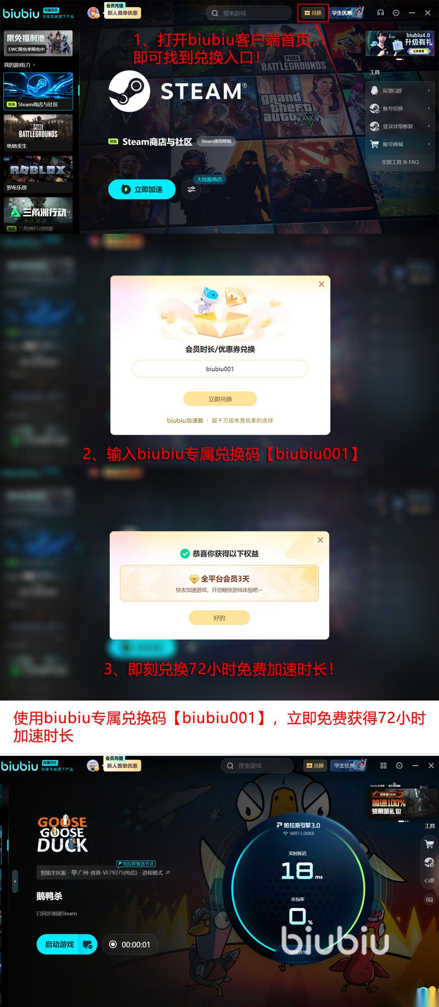 如果想要加速其他游戏的话,也可以使用这个兑换码的活动,现在新用户注册登录,完成实名认证,即可获得24小时免费加速时长,新老玩家可以使用兑换码【biubiu001】解锁三天全平台免费加速,总计96小时。