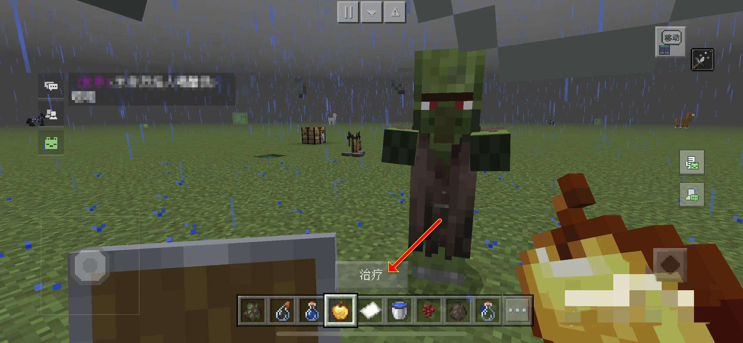1、准备1个金苹果,找到僵尸村民;2、在僵尸村民附近使用喷溅型虚弱药水,让它虚弱。;3、拿着金苹果靠近虚弱的僵尸村民,点击治疗。