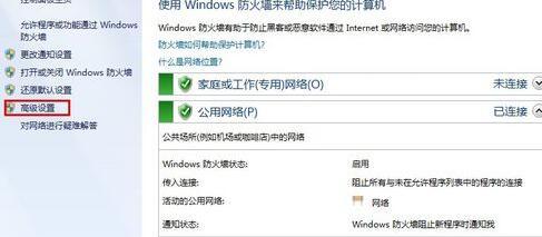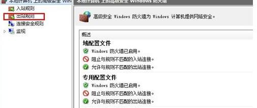 点击左边的高级设置,如下图红框标示,出现高级安全windows防火墙设置