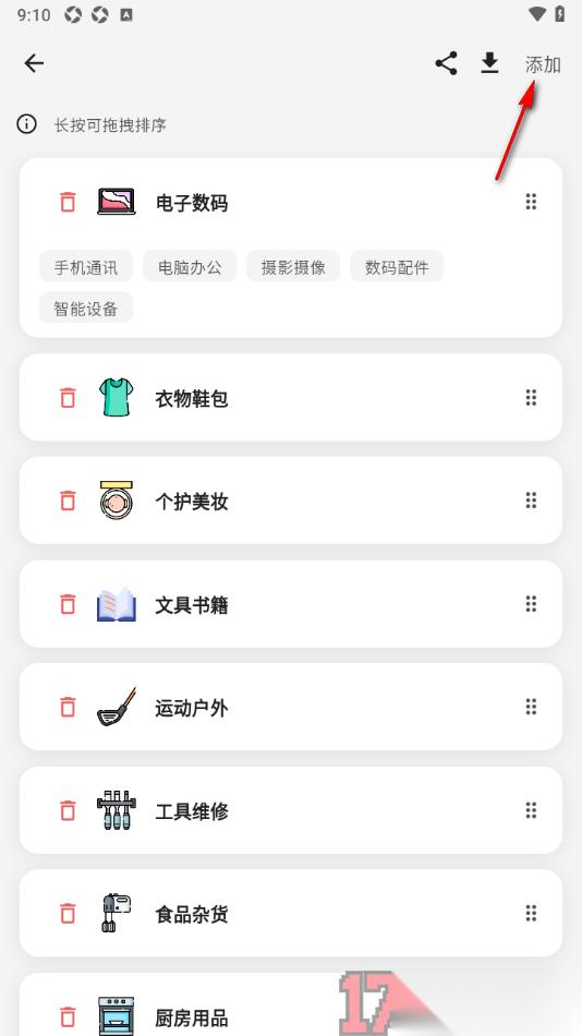 3.随后页面上会呈现出多种不同的分类,如果需要新增分类,点击右侧上方的【添加】按钮即可进入。