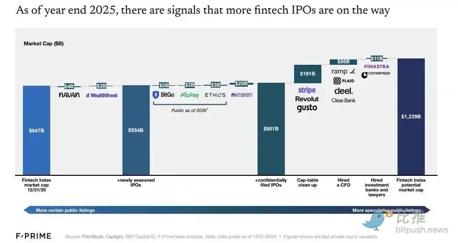 抛开私募交易不谈,IPO 在 2025 年确实显著回升。包括 Circle 和 Klarna 在内的 11 家风投支持的金融科技公司已经上市,且还有更多公司在路上。Kraken 和 Bitgo 已秘密提交申请,而 Ramp 和 Gusto 等公司则通过清理上限表(cap tables)、聘请新 CFO 或接洽投资银行做准备。F-Prime 估计,金融科技的总市值可能会从 9,470 亿美元增长到 1.2 万亿美元。