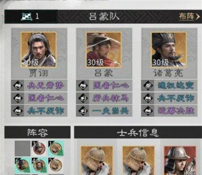 先说说这套阵容怎么摆。吕蒙站前排,但不占追击格,诸葛亮站在吕蒙追击格的位置,贾诩再站诸葛亮的追击格上。兵种方面,连弩军放贾诩上面,两个藤甲兵分别放在连弩军和贾诩前面,主要是用来挡伤害保护后排输出。这个站位看起来有点绕,但实际操作几次就明白了,关键是要让追击机制能顺利触发。