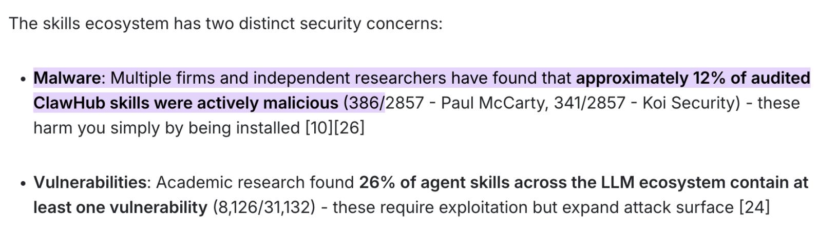 - 真实案例: 根据 Paul McCarty 和 Koi Security 等多家安全机构与独立研究员的最新联合审计报告,ClawHub 市场上高达 12% 的审计技能包(抽样 2857 个中发现了近 400 个毒包)是纯粹的活跃恶意软件。