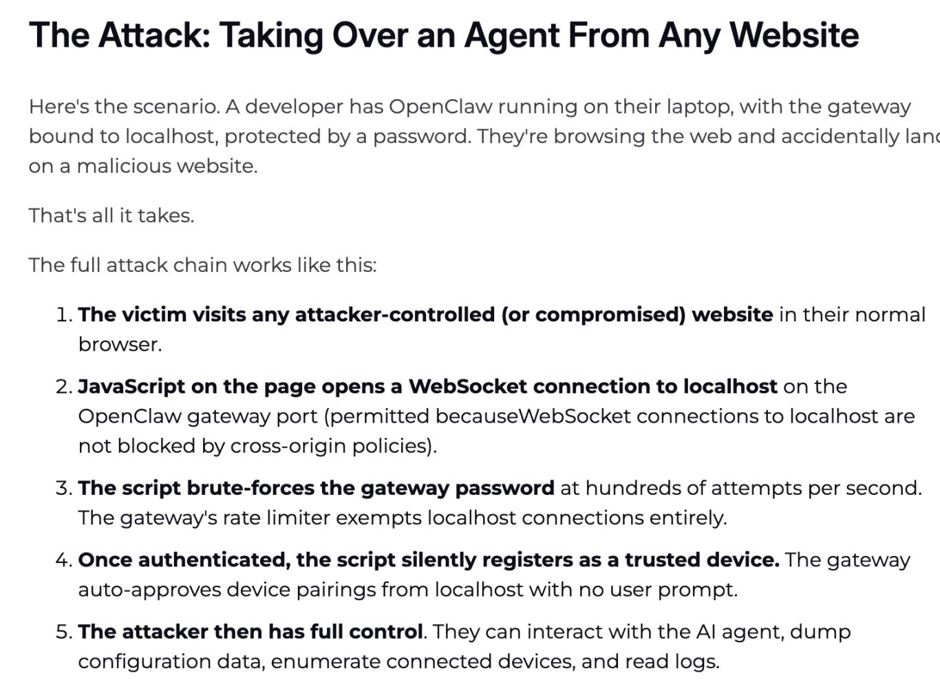 - 原理解析: 它的攻击逻辑极其变态——你只要在后台挂着 OpenClaw,前端浏览器不小心访问了一个带毒的网页,哪怕你什么授权都没点,网页里暗藏的 脚本就会利用浏览器对 localhost(本地主机)WebSocket 连接不设防的机制盲区,瞬间向你的本地 Agent 网关发起攻击。