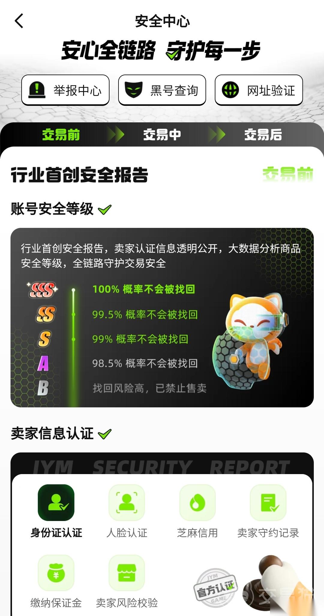 交易猫保持着非常良性的监管体系,在安全风控上严格管控每一个账号,光是从游戏账号上架那一刻开始,不仅仅只是对卖家需要进行信用认证,更是会对账号使得交易记录以及是否为黑号进行查验,信用更为良好的卖家才能够让账号显示的靠前,并且还会对每一个账号评测安全等级,直接将卖家认证的信息透明公开化,通过大数据的查验来检测账号被找回的概率有多少,目前在平台中符合S级别以上的账号多达90%以上,安卓同学想要购买点击上方的按钮即可进行跳转下载,苹果手机用户到浏览器搜索交易猫即可找到官方。
