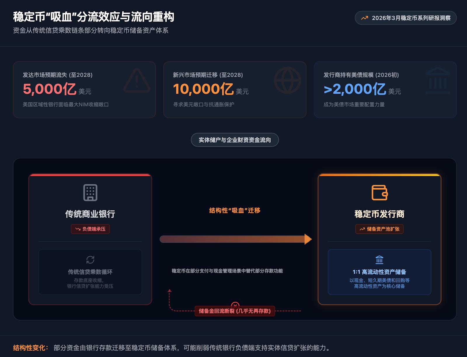 稳定币的扩张已越过技术试验的范畴,开始对传统商业银行的核心商业模式形成实质性侵蚀。这种侵蚀并非单向的技术替代,而是从负债端(存款吸血)与中间业务端(支付脱媒)同时发起的双向挤压。高信用等级稳定币凭借近乎零摩擦的链上清算网络,正在建立一套平行于传统代理行体系的“影子基础设施”,而2026年《GENIUS法案》的合规落地,则加速了这一解构过程的制度化确认。
