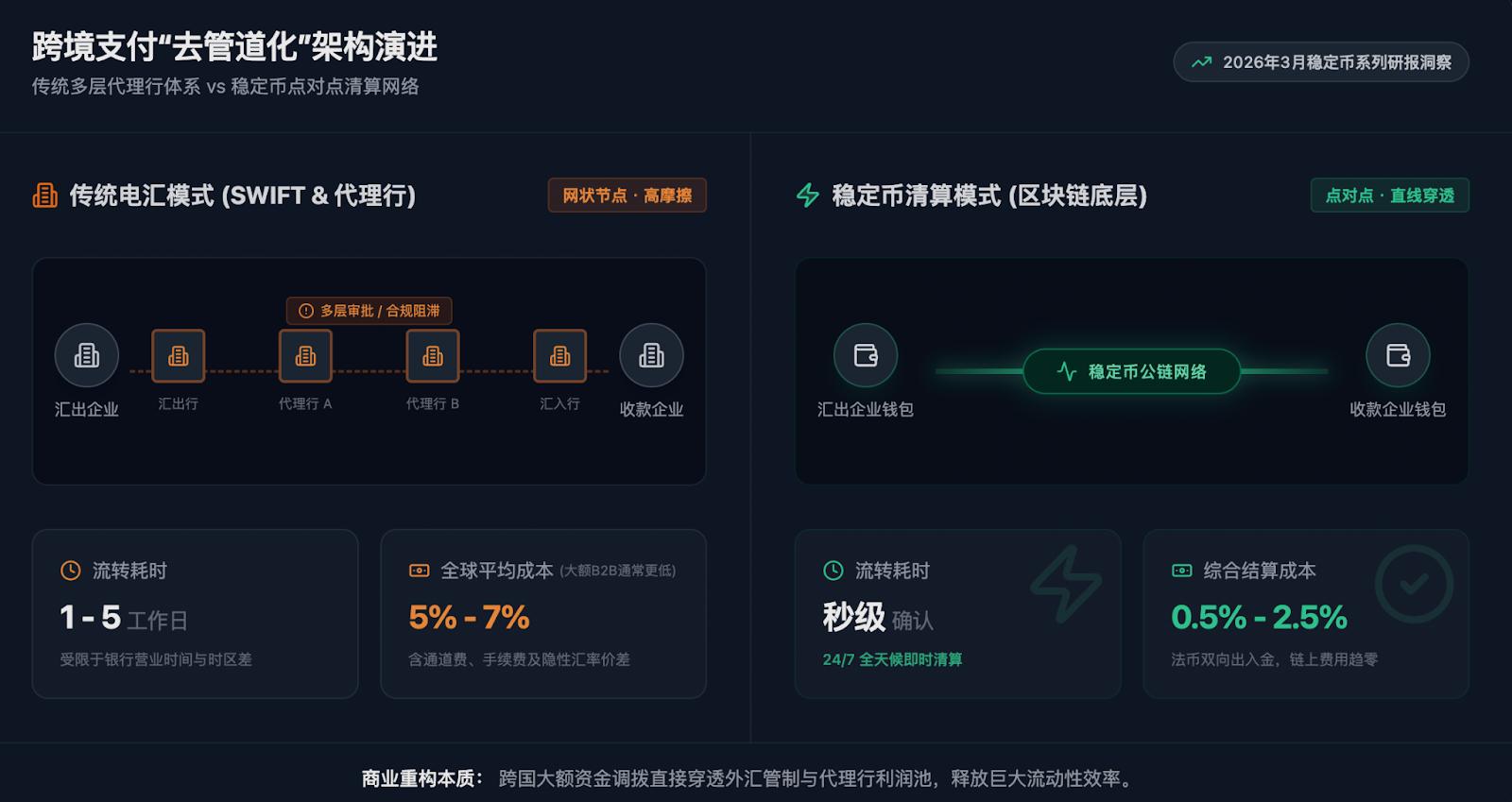 如果说存款流失动摇了银行的负债端基石,那么稳定币在跨境支付与商业清算领域的迅速渗透,则直接瓦解了传统金融基于SWIFT网络与多层代理行体系构建的中间业务护城河。