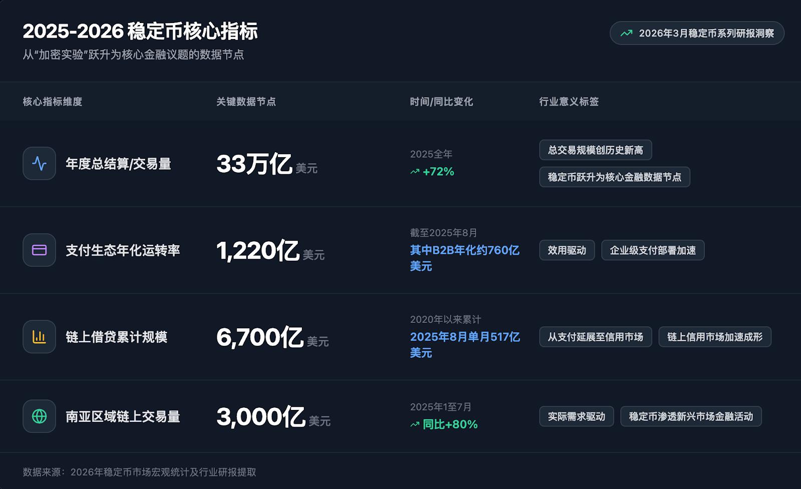 更具深远影响的是,支撑这一天文数字的底层结构已发生实质性偏移。稳定币正大规模剥离单纯的“投机锚定物”属性,向实体经济与主流金融市场深度渗透。沃顿商学院在2026年2月发布的《稳定币工具包》中明确指出,稳定币已实质性地“迈向主流”。在具体的业态图景中,效用驱动的特征日益显著,B2B领域的应用实现了从极客尝试到系统化部署的跨越,月度交易额从2023年初的不足1亿美元激增至2025年中期的逾60亿美元。目前,包括B2B支付、薪资发放及跨境汇款在内的整体稳定币支付生态系统,其年化运转率已触及约1220亿美元,显示出极强的商业渗透性。