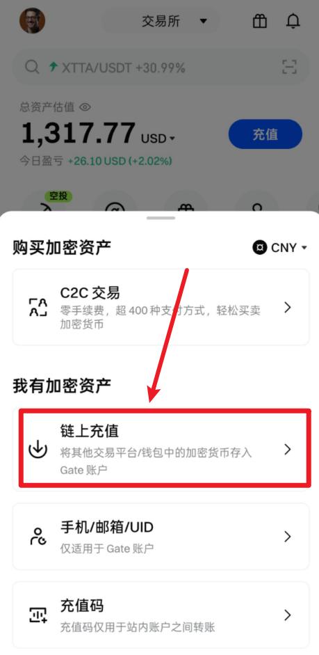2.获取地址:打开芝麻交易所App首页,依次点击“充值” > “链上充值”。在 搜索框中查找并选择“Pi”,复制系统生成的充值地址备用。