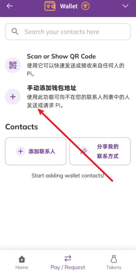 4.发起转账:点击“Pay”,选择“手动添加钱包地址”。