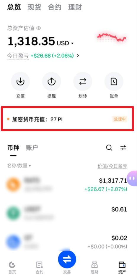 转账完成后,返回芝麻交易所App。链上确认需要一定时间,稍后您会在系统内看到“加密货币充值 Pi 正在处理中”的提示。等待充值完全到账后,即可在“我的资产”中查看到这笔Pi币,并可以开始进行交易售卖。