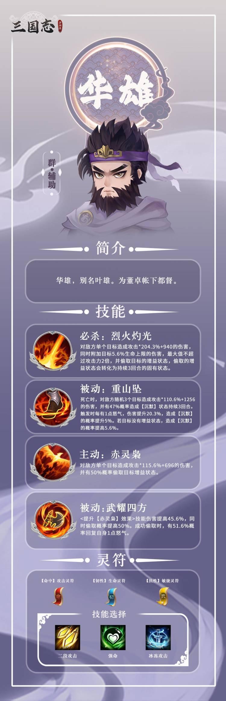 三国志异闻录中,华雄是群雄辅助武将,擅长偷取增益、驱散状态,死亡时造成爆炸伤害并概率控制敌方。灵符优先选命中攻击、韧性生命、状态敏捷类。阵法石推荐敏捷·攻击或暴击·攻击组合。培养上性格选暴躁或勇猛,训练主攻击副敏捷,研究侧重攻击、敏捷、状态命中与暴击。