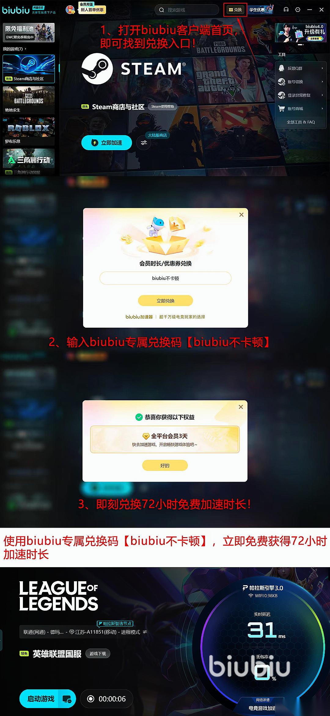 同时新用户完成注册后,可立即免费开启24小时全游戏不限速加速,所有用户在兑换中心输入专属口令【biubiu不卡顿】,还能额外领取3天免费加速时长,其中新用户可以叠加福利获得96小时的加速哦。