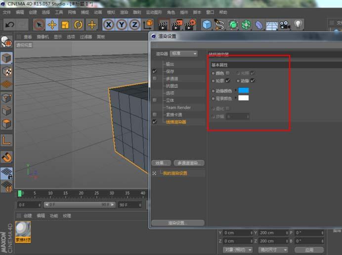 5、这样有了线框,但是还是会有物体出现,那么我们就得在渲染设置里加一个线描渲染器,然后给一下参数就可以了,这时也可以把素描卡通的勾取消掉了(其实只要用线描渲染器就可以得到这样的效果,只不过素描卡通的可控性更大,可以得到更丰富的,你可以细致的调一下)。