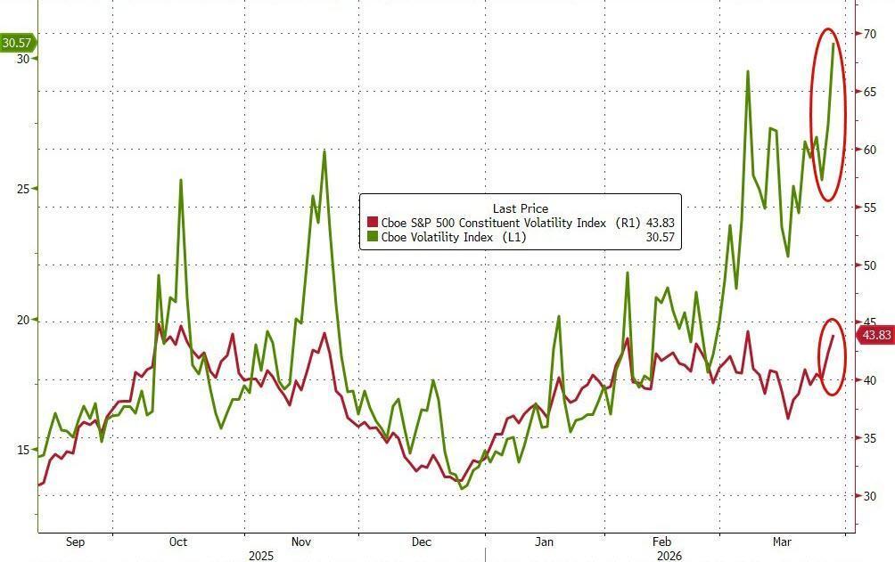 原油的狂飙直接拉爆了市场的恐慌情绪。衡量波动率的VIX指数盘中直线拉升,最终收于31.05,正式突破30这道生死线。