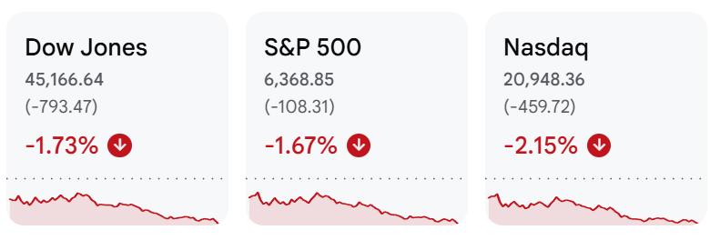 截至收盘,道指跌幅1.72%,纳指大跌2.15%,标普500下挫1.67%。道指和纳指均较历史高点回撤超10%,正式宣告进入技术性回调区间。