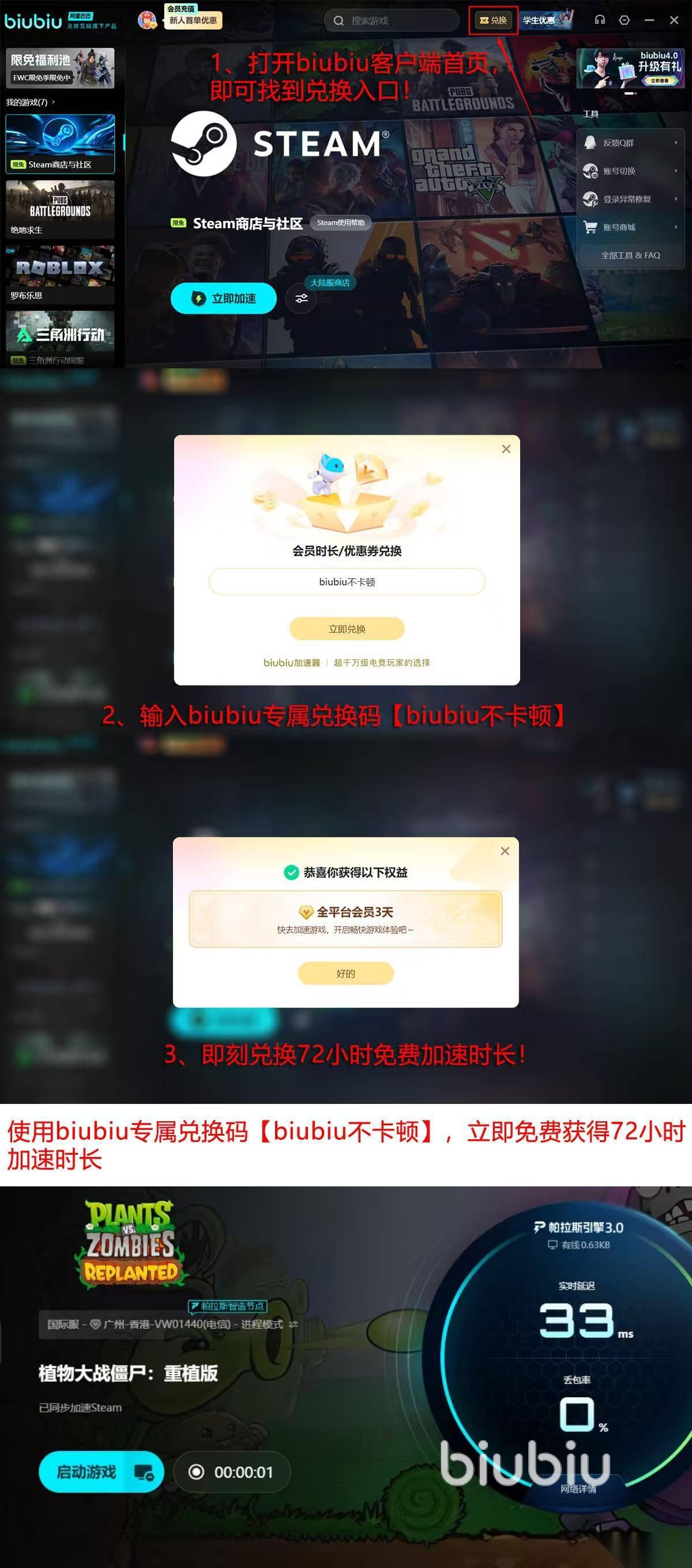 现在还有诚意福利给到大家,新人用户注册登录之后就可以领取到24小时的加速时长,此外不管你是新人,还是老人,只要是第一次输入【biubiu不卡顿】的口令,就可以拿到72小时额外时长体验,新人能把两项叠加在一起,拿到整整96个小时。