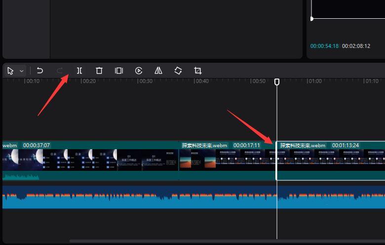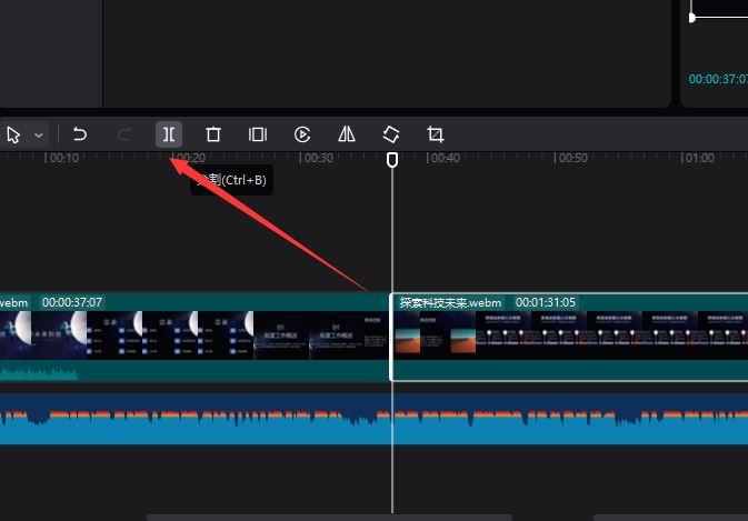 当音频分离后,将时间轴移动到画面与音频不同步的位置 ,点击“分割”项。
