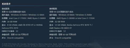 《哥特王朝:重制版》Steam页面近日更新了PC版配置要求。相比试玩版,新配置要求大幅提升。游戏仍定于2026年6月5日发售,距上市仅剩两个月,这些配置大概率已是最终方案。