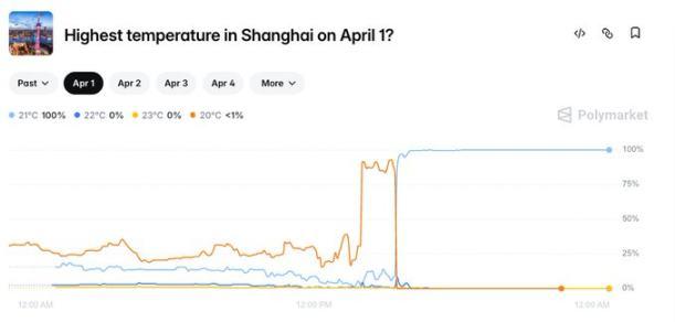上海天气市场这两周,反复出现同一种走势:某个档位的温度从早上开始一路领跑,概率稳稳压着其他档位,眼看就要结算,最后一小时突然反转,另一个档位从接近 10% % 直接冲到 100%。
