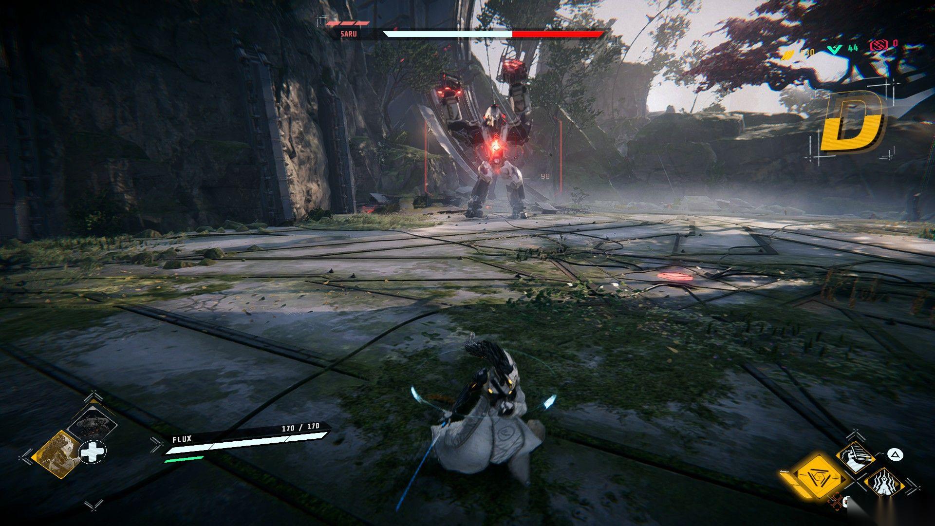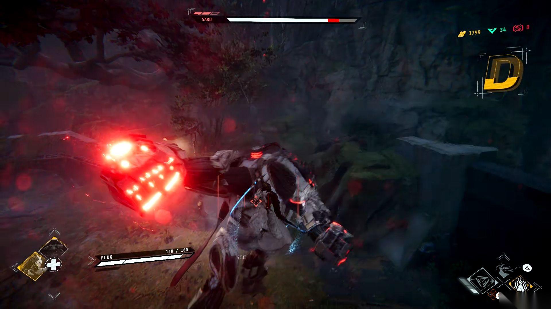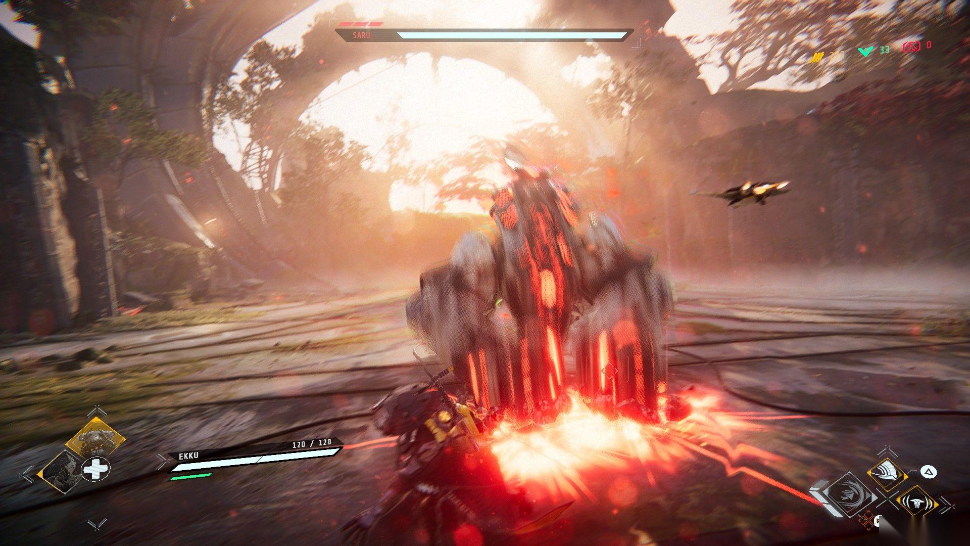 萨鲁会施展第一阶段的两连击组合技,并混合使用砸地和冲击波。你需要注意的一点是,当它蓄力时,会射出三道激光束,你必须按下闪避来躲避它们。
