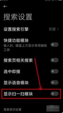 5、在【搜索设置】页面,找到【显示扫一扫模块】,可以看到该功能没有打开。