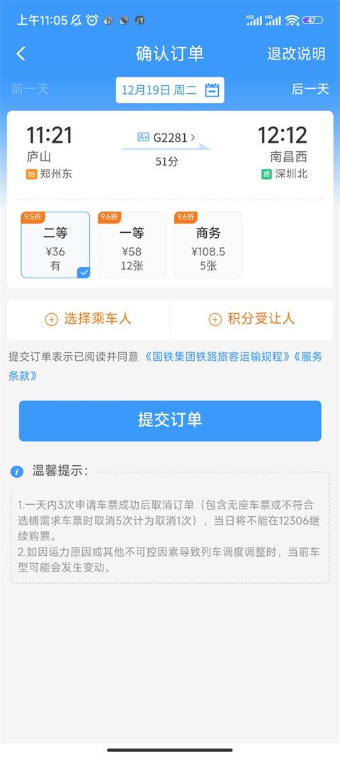 3、积分允许兑换的车次以12306官网查询结果为准,兑换车票时,100积分等价于1元人民币。