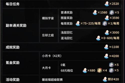 2、模拟宇宙每周300.一个月就是1200星石。首次通关还可以获得一次性的900星石。