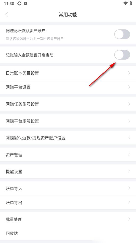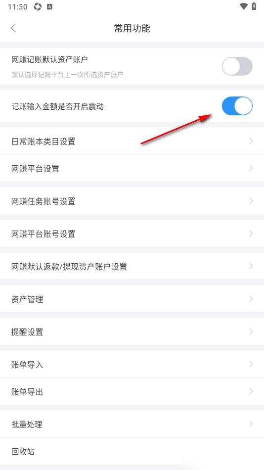 3.在打开的窗口中,用户需要找到显示的【记账输入金额是否开启震动】选项,将其开关按钮点击启用即可。