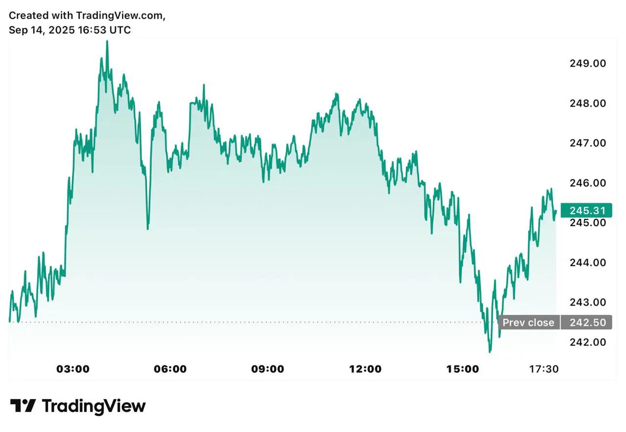Solana 的交易价格接近 250 美元,支撑位在 230 美元左右,阻力位在 260-270 美元区域。如果能突破 250 美元,将有望突破 300 美元,然后突破 305 美元左右的先前高点。如果价格跌破 220 美元,多头希望看到买盘迅速回升,接近 200 美元,以保护价格结构。