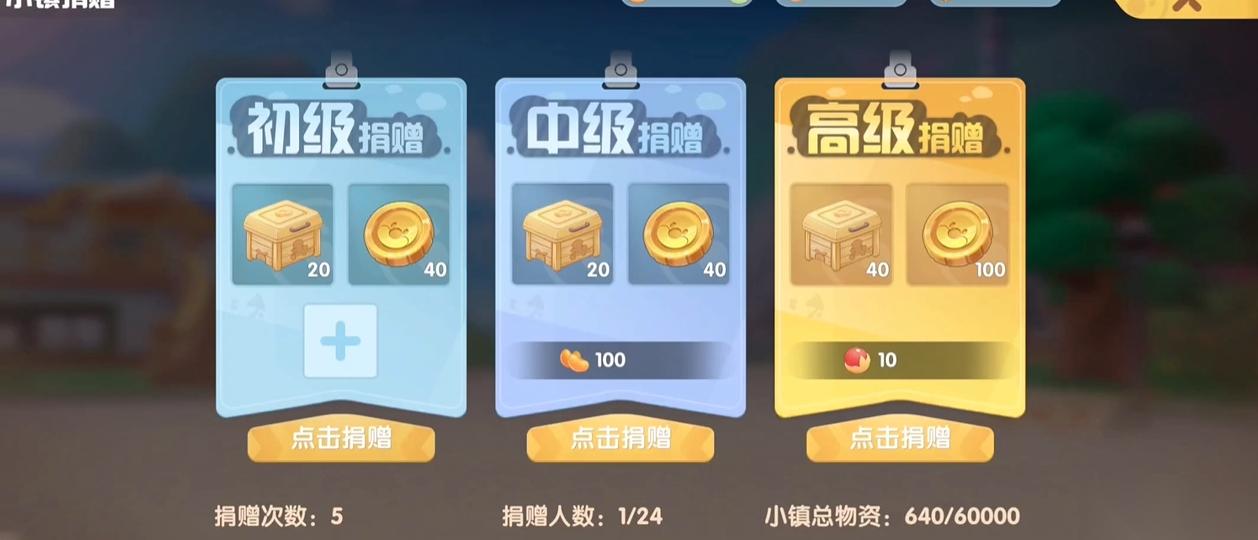 另外小镇里还有贝琪,主要是管理小镇的一些内容。在贝琪这里每天都有三个档次的捐赠,每天可以捐赠五次。捐赠了之后,小镇可以获得物资,个人可以获得贡献。最低档就是只花摩尔币,最高级的则是花金豆,不管捐赠哪种豆子,都能获得贡献。