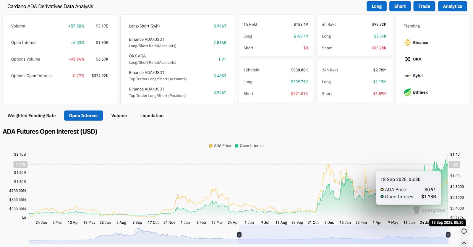 链上衍生品指标强化了看涨倾向。ADA 期货未平仓合约攀升 6%,至 18 亿美元,日交易量飙升 57%,至 35 亿美元。币安平台的多空仓位比例依然偏向看涨,顶级交易员的多头仓位比例接近 4:1。