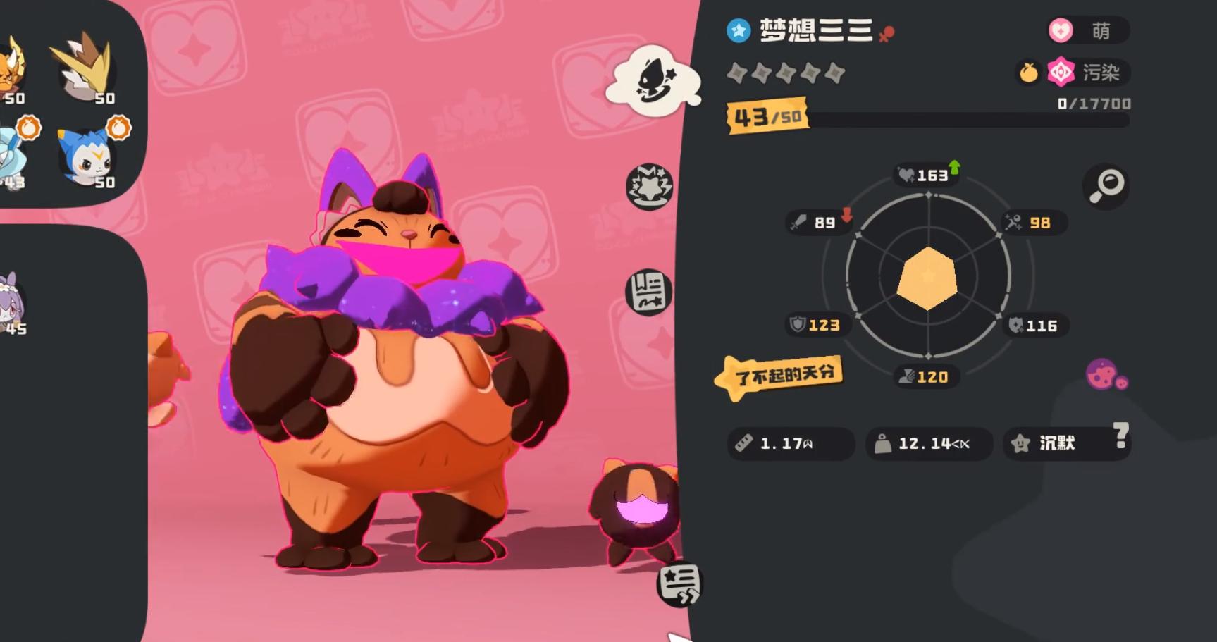 梦想三三:雪天队的核心永动机,主控制,选择首领形态进场。三三的特性“鼓气”在使用能耗为3的技能时可以永久提升10%的攻防能力,而且首领化之后该增益效果可以保留。技能选择“摇篮曲”和“赤子之心”,能耗都为3,“摇篮曲”睡眠控场神技,只要不被打断就可以无限使用,直到对手换宠浪费回合;“赤子之心”拥有回血+回蓝的效果,这两技能就是永动机在世,可以实现永劫循环。