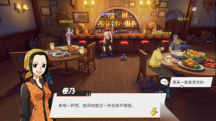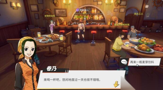 要开始这任务,得先去酒馆找卷乃。跟他对话,连续选三次“来一瓶麦芽饮料”,然后选“付钱”。这样任务就触发了。