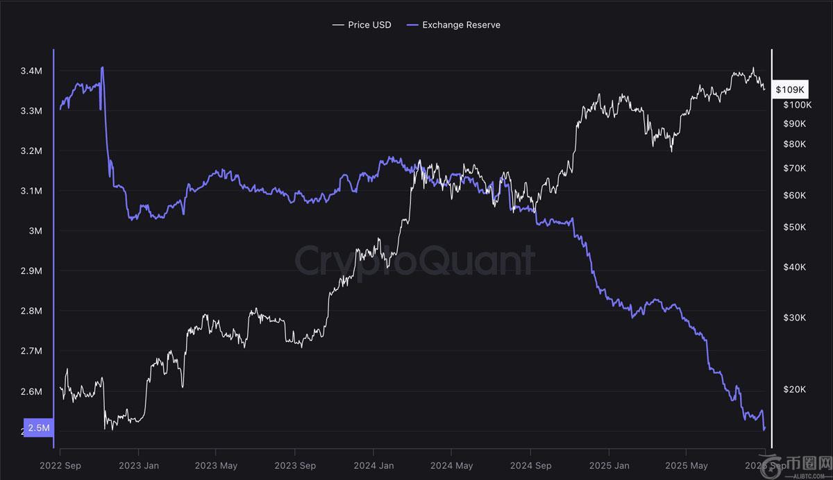 比特币交易所储备,即交易所持有的比特币总量,继续减少,目前处于多年低点。:CryptoQuant