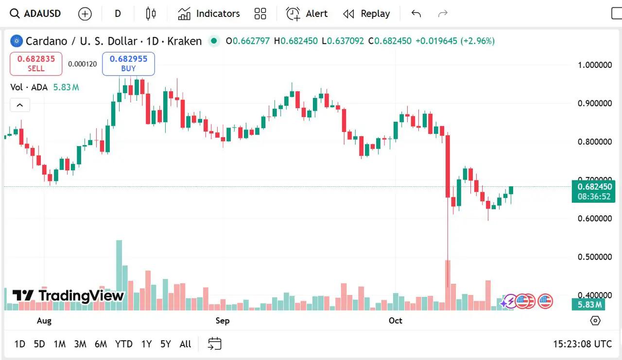 截至撰写本文时,Cardano 交易价格为 0.6828 美元,日涨幅为 1.63%,市值
