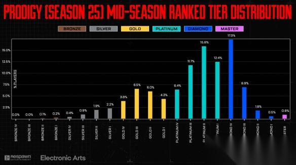 我们匹配系统的核心原则始终是避免刻意制造匹配障碍。虽然某些不可控因素可能导致匹配延迟,但我们始终致力于构建能让所有玩家终获匹配的规则体系。尽管此前测试效果积极,我们仍暂缓在26赛季推行新测试——随着赛季调整与降落区机制的引入,钻石及以上段位玩家数量有所下降(下图可见)。