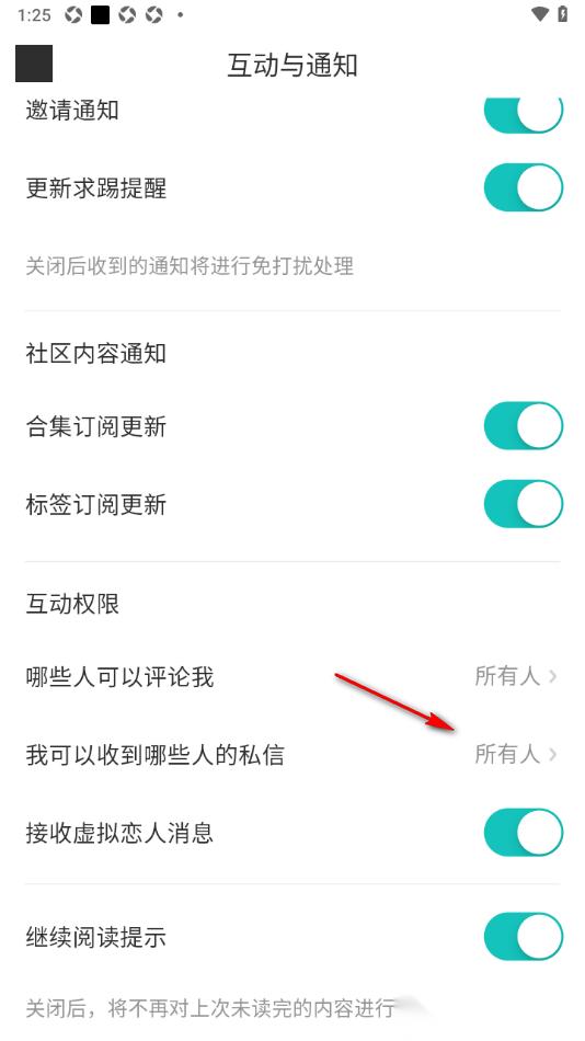 4.这时候我们就可以在打开的窗口中,将【我可以收到哪些人的私信】选项,将其点击开启即可。