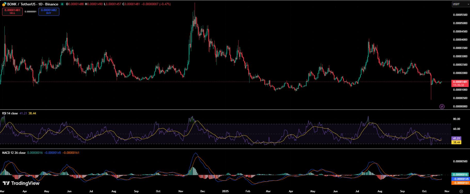 目前,BONK 在币安上的交易价格接近 0.0000148 美元,在近期挥发性