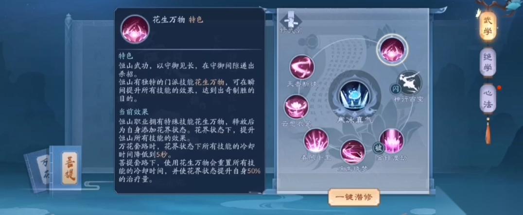 恒山派作为治疗与防御兼备的职业,心法设计围绕增益效果与生存能力展开。花生万物是核心被动技能,提供持续10秒的伤害增益;万花飘零兼具治疗与范围伤害;朔风吹雪通过叠加减速和减防效果削弱敌方战力;回风拂柳的穿透伤害和拨云见日的广域攻击进一步强化输出能力。护体真气和神行百变是防御型加点的关键,前者提升抗伤能力,后者增强机动性。