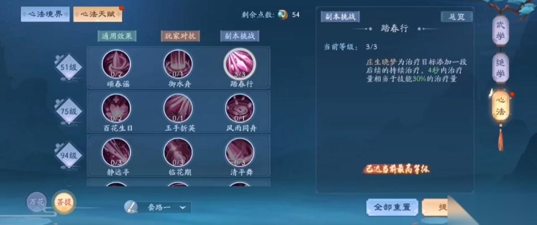 在团队副本中,恒山需优先强化治疗技能,如颂春谣、踏春行、百花生日等,配合静远亭的残血治疗增益和临花期的持续恢复效果。竞技场景则需侧重控制与反制,暗香疏影和青丝戏鸾可干扰敌方行动,云流秋月与芳菲未尽提供爆发伤害,弱水三千和雪履三秋则用于应对高压力局面。天赋重置功能允许玩家根据需求调整配置,但需注意资源消耗。