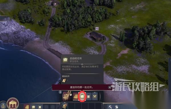 在建设菜单选择居民住所建造,吸引自由民来居住。居民住所也都要用道路连接到贸易站。