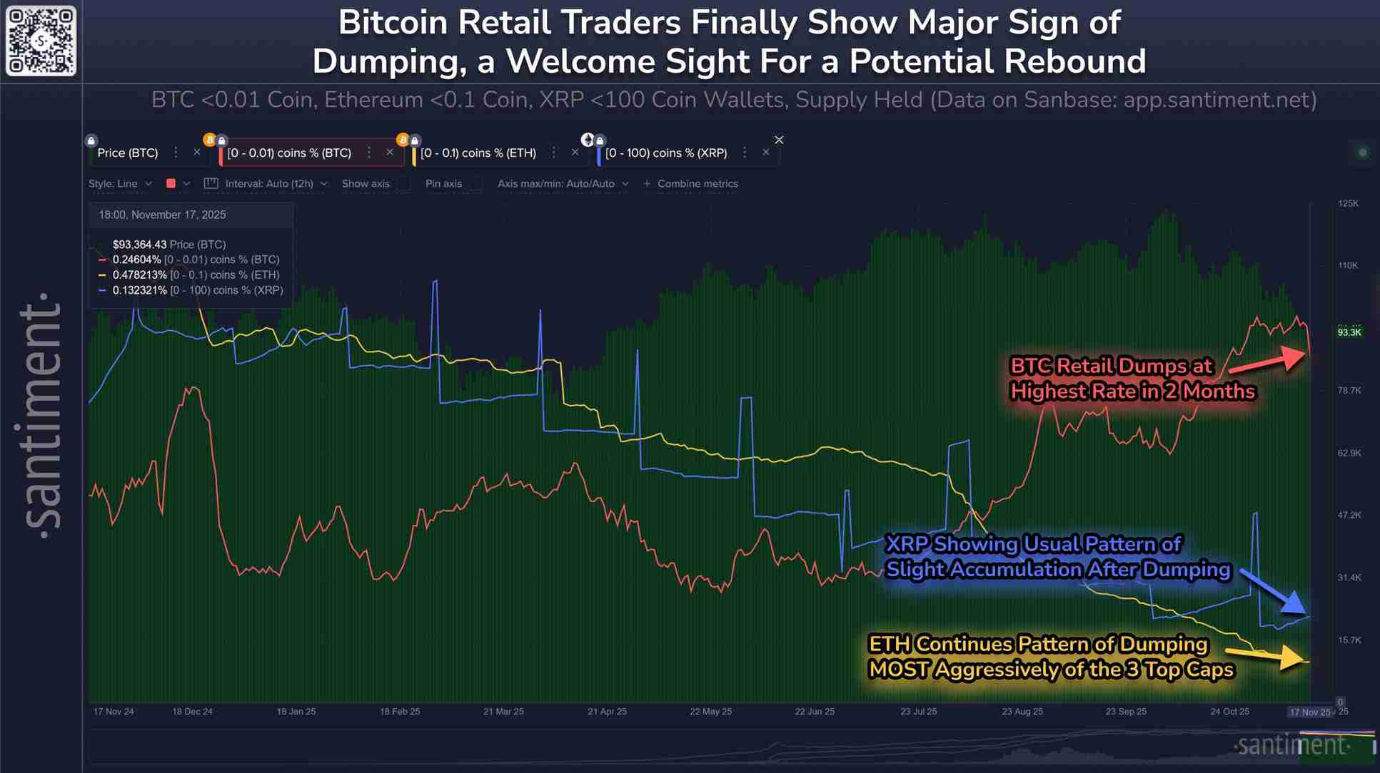 根据Santment的最新数据,过去五天内,持有低于0.01 BTC的钱包余额减少了约0.36%,而持有低于0.1 ETH的钱包在一个月内减少了约0.9%。XRP钱包自 11 月初以来,抛售数量不足 100 枚,跌幅达 1.38%。