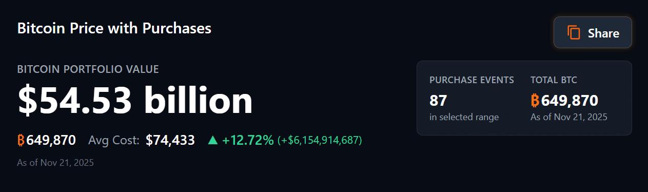 数据来自SaylorTracker数据显示,Strategy持有的比特币价值已降至545.3亿美元。具体而言,该公司持有的649,870枚比特币目前仅相当于61.5亿美元的未实现收益,数月来首次跌破100亿美元的大关。